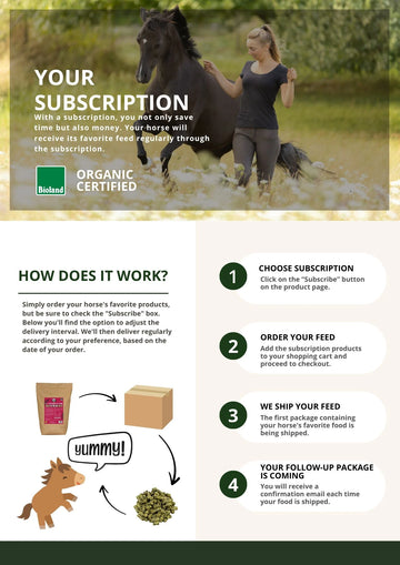 We know how much you love your horse – and we love our work just as much. That's why every product that leaves our farm reflects our full commitment to the health of your horse . With over 30 years of experience in organic farming, we know that sustainable practices are the key to healthy horses. Every cut, every harvest is done with care, respect and knowledge, that only the best is good enough for your horse. We cultivate our meadows and fields on approximately 300 hectares according to the strictest organic principles . For you, that means: little sugar, no pesticides, no chemical fertilizers – just pure nature . Because we are convinced: What doesn't belong in the soil, doesn't belong in your horse's feed either .