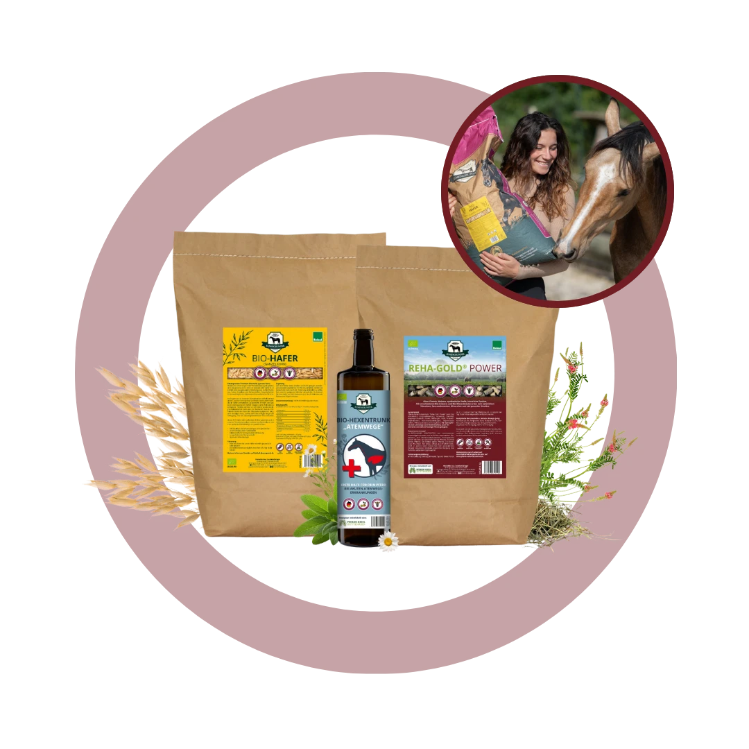 In this bundle you receive 4 kg of Reha-Gold “Power”, 4 kg of oats, and 1 bottle of Hexentrunk.