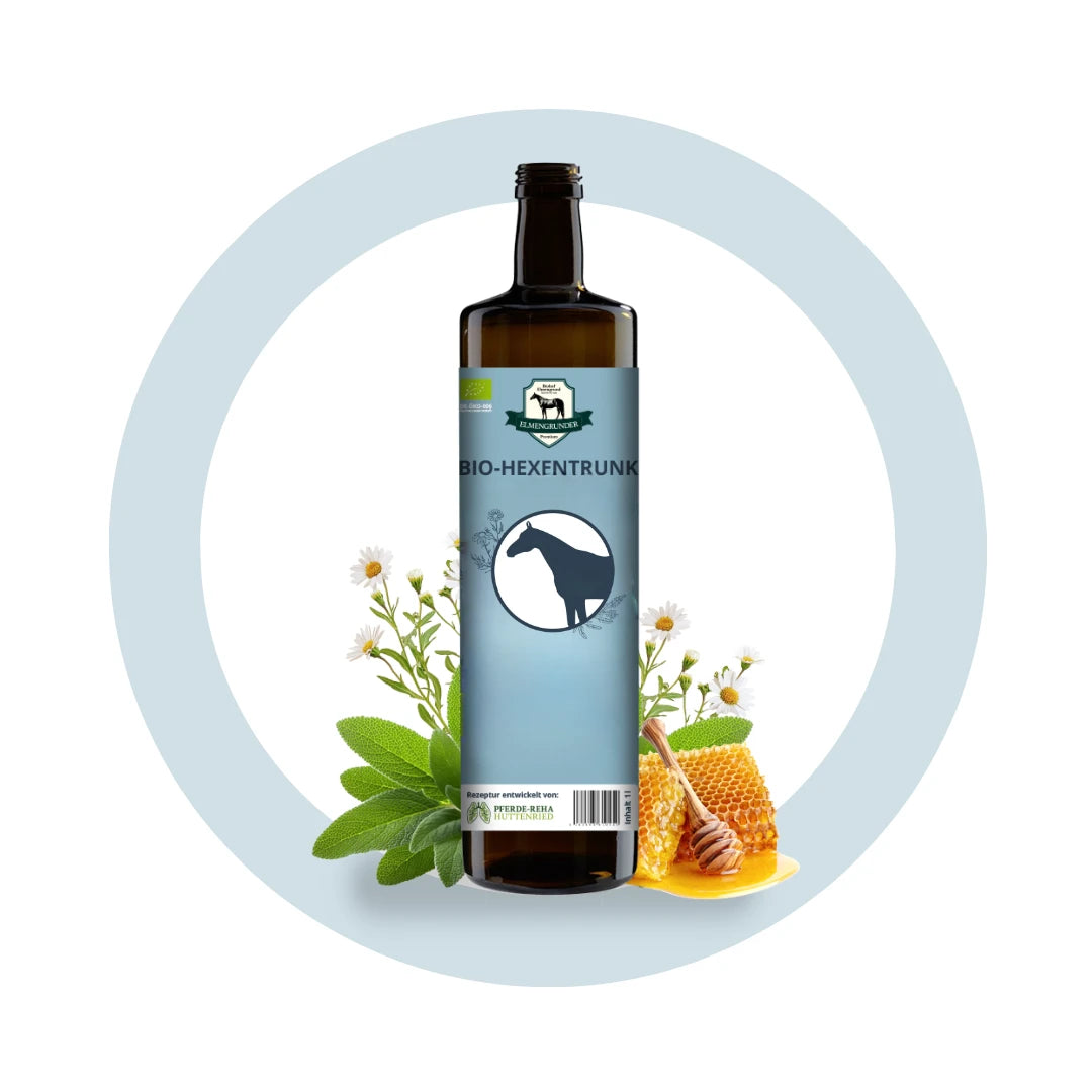 Der Elmengrunder Premium Bio Hexentrunk ist ein ergänzendes Futtermittel für Pferde. Die Rezeptur enthält pflanzliche Rohstoffe wie Salbei, Kamille, Fenchel, Lindenblüten und Aronia sowie Honig. Alle Zutaten werden verarbeitet, um die natürlichen Bestandteile weitgehend zu erhalten.