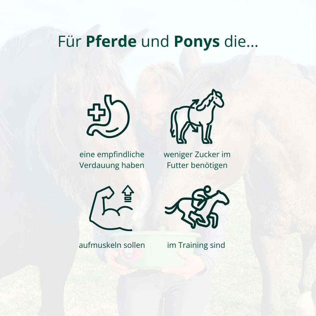 Außerdem ist die Pflanze reich an Proteinen, die essenziell für den Aufbau von Muskulatur, Haut und Hufe sind. So fördert sie die Regeneration nach Belastungen und unterstützt den Muskelaufbau bei Sport- oder Seniorenpferden.