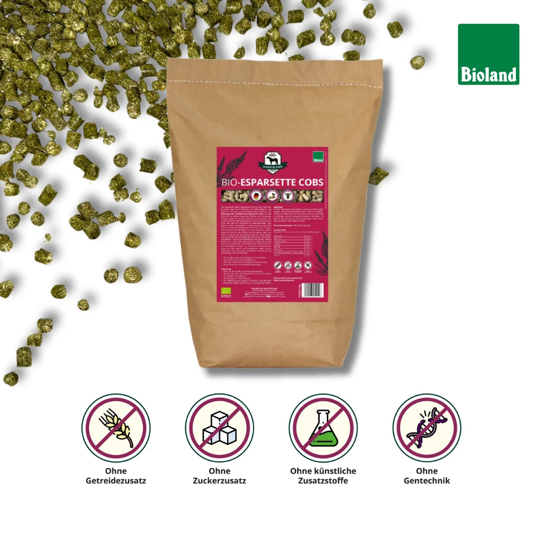 Durch die positiven Eigenschaften, den biologischen Anbau, die schonende Warmlufttrocknung und die Verzicht auf Zusatzstoffe stellen unsere Esparsette Cobs eine ganz besondere Aufwertung des Grundfutters für Ihr Pferd dar.