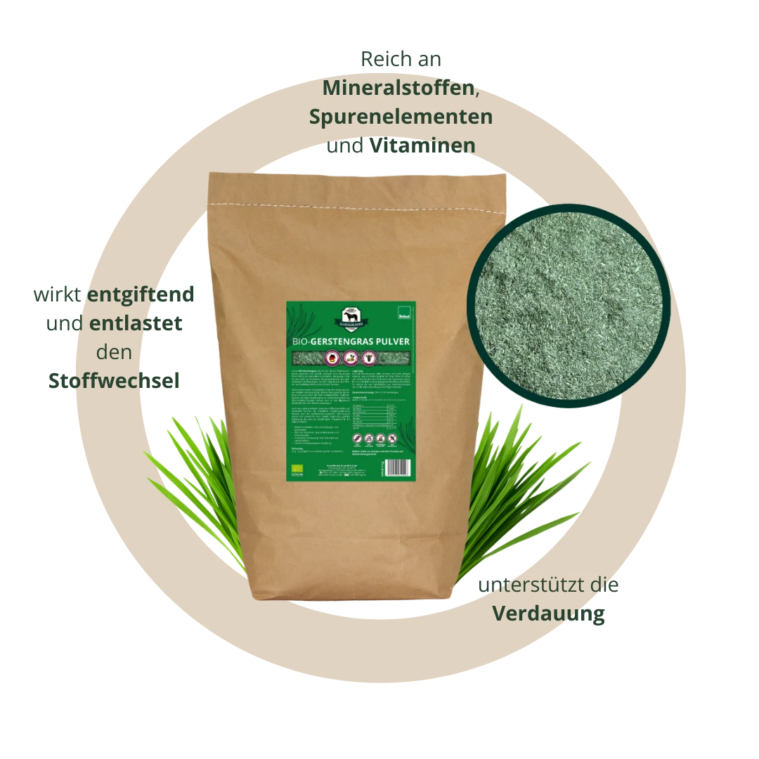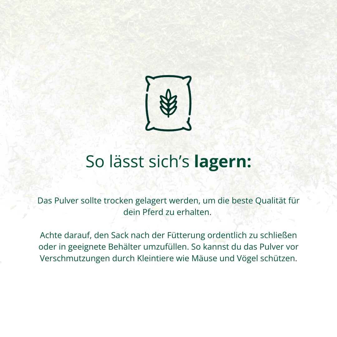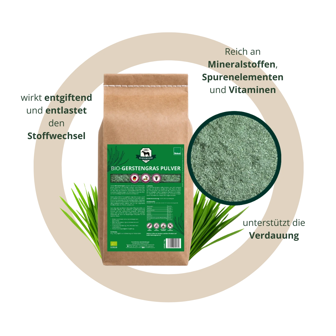 Unser Gerstengras wird in der frühen Wachstumsphase geerntet und enthält dadurch eine besonders hohe Dichte an wertvollen Vitalstoffen. Die jungen Blätter sind reich an Vitaminen, Spurenelementen und antioxidativen Verbindungen, die den Organismus des Pferdes auf vielfältige Weise unterstützen können.