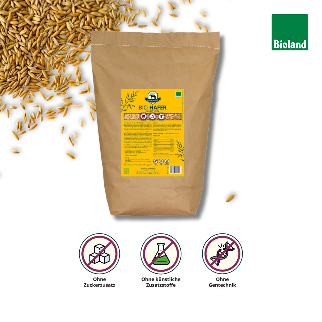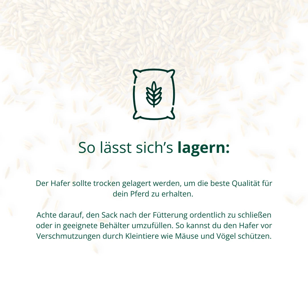 Hafer wird schon lange in der Pferdefütterung eingesetzt. Und das ganz zurecht, denn er verbirgt tolle Vorteile. Er enthält eine ausgewogene Mischung aus Kohlenhydraten, Fetten, Eiweißen und Ballaststoffen. Diese Nährstoffe sind wichtig für die allgemeine Gesundheit des Pferdes. Im Gegensatz zu anderen Getreidearten enthält er kein Gluten, was ihn verträglicher und leicht verdaulich macht. Die in Hafer enthaltenen Ballaststoffe fördern eine gesunde Verdauung und helfen, Magen-Darm-Probleme zu vermeiden.