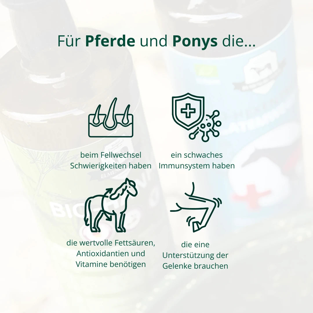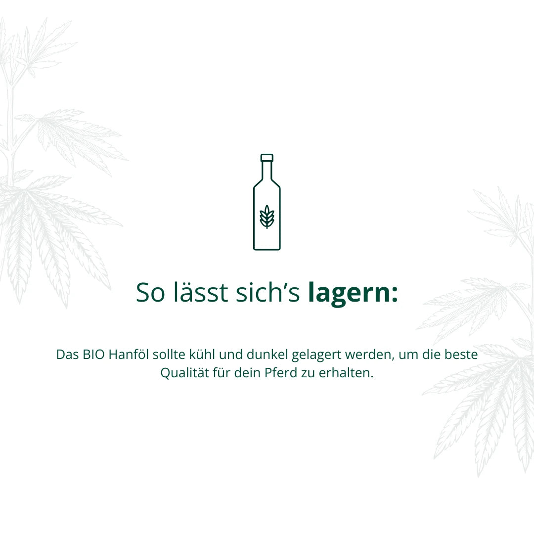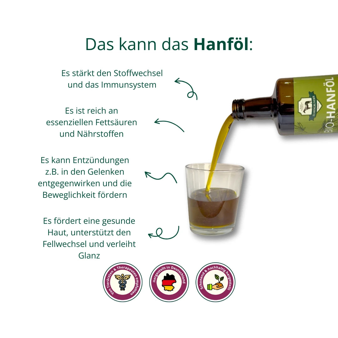 Unser Elmengrunder Premium BIO Hanföl wird aus sorgfältig ausgewählten und biologisch angebauten Hanfsamen durch schonende Kaltpressung gewonnen. Es enthält wertvolle Omega-3- und Omega-6-Fettsäuren, Antioxidantien und Vitamine, die das Wohlbefinden Deines Pferdes auf natürliche Weise unterstützen.