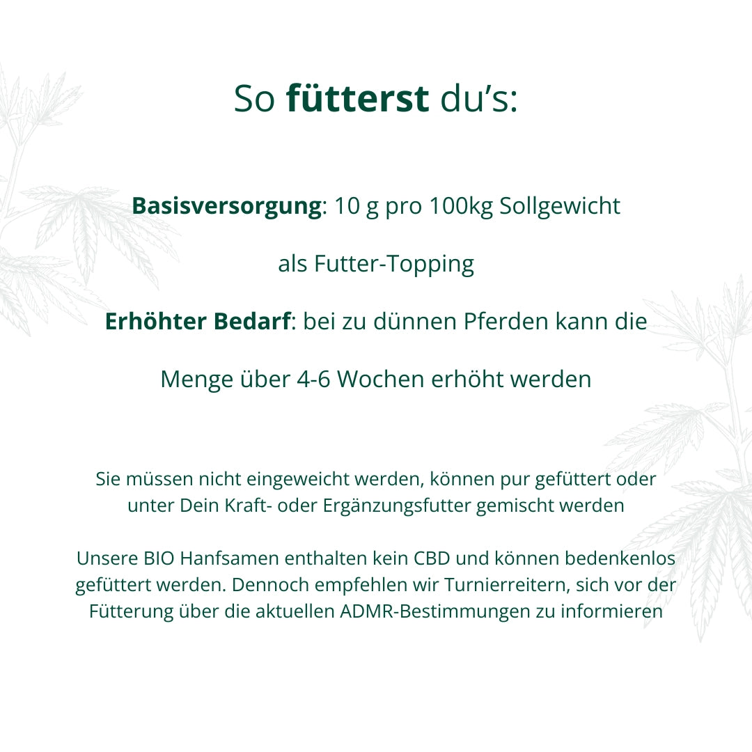 Die Hanfsamen sind vielseitig einsetzbar und lassen sich gut mit anderen Futtermitteln kombinieren. Ihre natürliche Zusammensetzung ermöglicht eine einfache Handhabung und Einbindung in unterschiedliche Fütterungskonzepte.