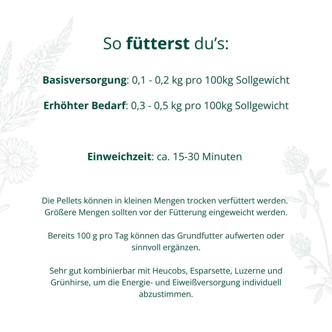 In enger Zusammenarbeit mit Pferdegesundheit von Sarah Ullrich entwickelt, vereinen wir unsere Kraft & Kraut Pellets hochwertige, biologische Zutaten mit fundiertem Wissen rund ums Pferd. Die durchdachte Mischung aus über 20 Pflanzen – darunter nährstoffreiche Wiesengräser, ausgewählte Kräuter sowie eiweißreiche Komponenten wie Luzerne, Esparsette und Topinambur, die einen positiven Beitrag zur Darmgesundheit leisten kann – bietet ein wertvolles Grundfutter für Dein Pferd: ob Freizeitpartner, Senior oder Stoffwechselkandidat.