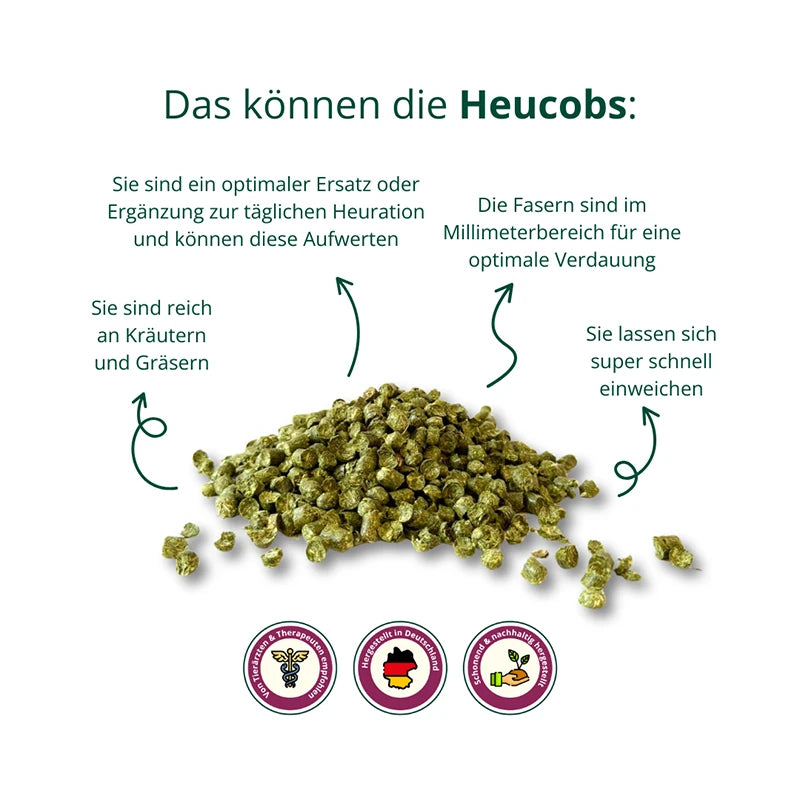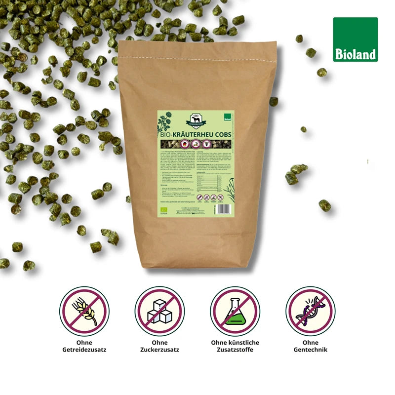Unsere Premium BIO Kräuter-Heucobs enthalten viele wichtige Vitamine und Mineralstoffe für ein starkes Immunsystem, glänzendes Fell, stabiles Horn und einen gesunden Stoffwechsel. Sie sind durch die schonende Ernte, Trocknung und Verarbeitung sehr staubarm und bieten eine ausgezeichnete Mikrobiologie.