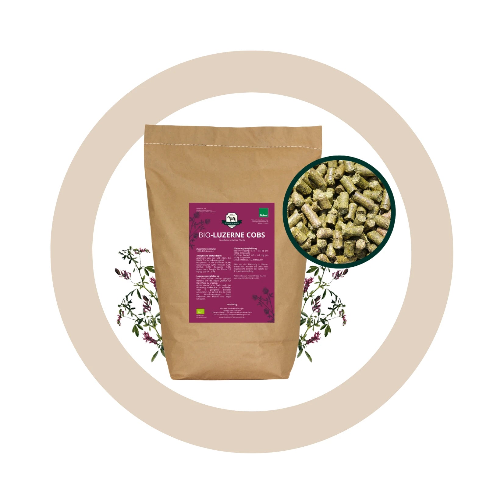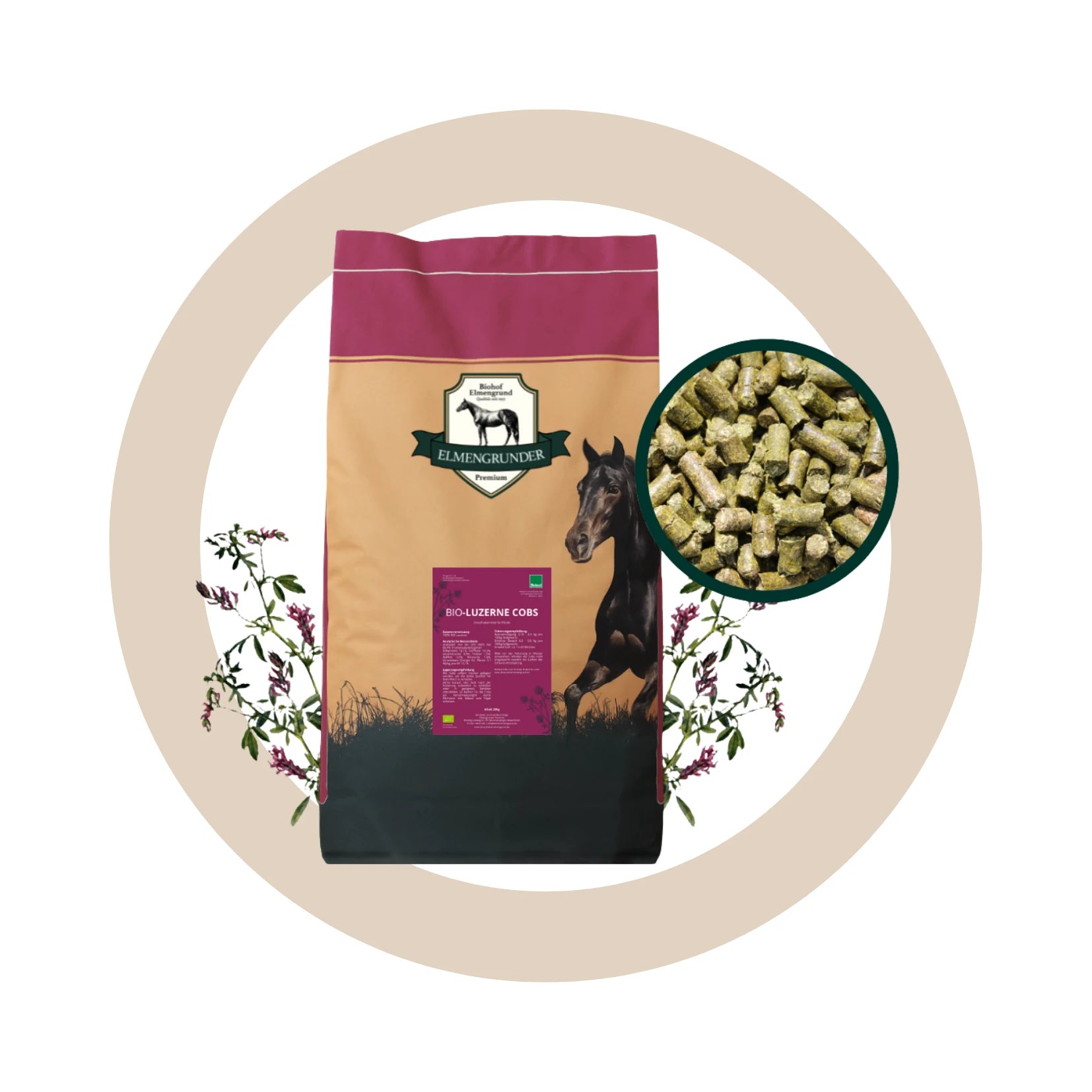 Die BIO Luzerne Cobs sind ein Einzelfuttermittel für Pferde. Sie eignen sich als strukturreiche Komponente zur Ergänzung der täglichen Futterration. Durch den natürlichen hohen Proteingehalt können sie optimal an Pferde mit erhöhtem Bedarf verfüttert werden.