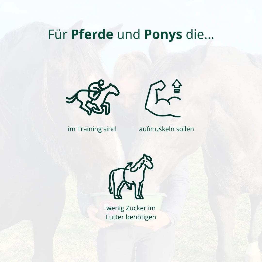 Unsere BIO Luzerne Cobs bieten im Vergleich zu Müslis und Co. einen geringen Zuckergehalt, dafür aber einen hohen Proteingehalt. Dieses Protein ist essenziell für den Muskelaufbau sowie für eine gesunde Haut und glänzendes Fell. Somit sind sie besonders geeignet als Kraftfutterersatz für den Einsatz im Turniersport oder für ältere oder zu dünne Pferde.