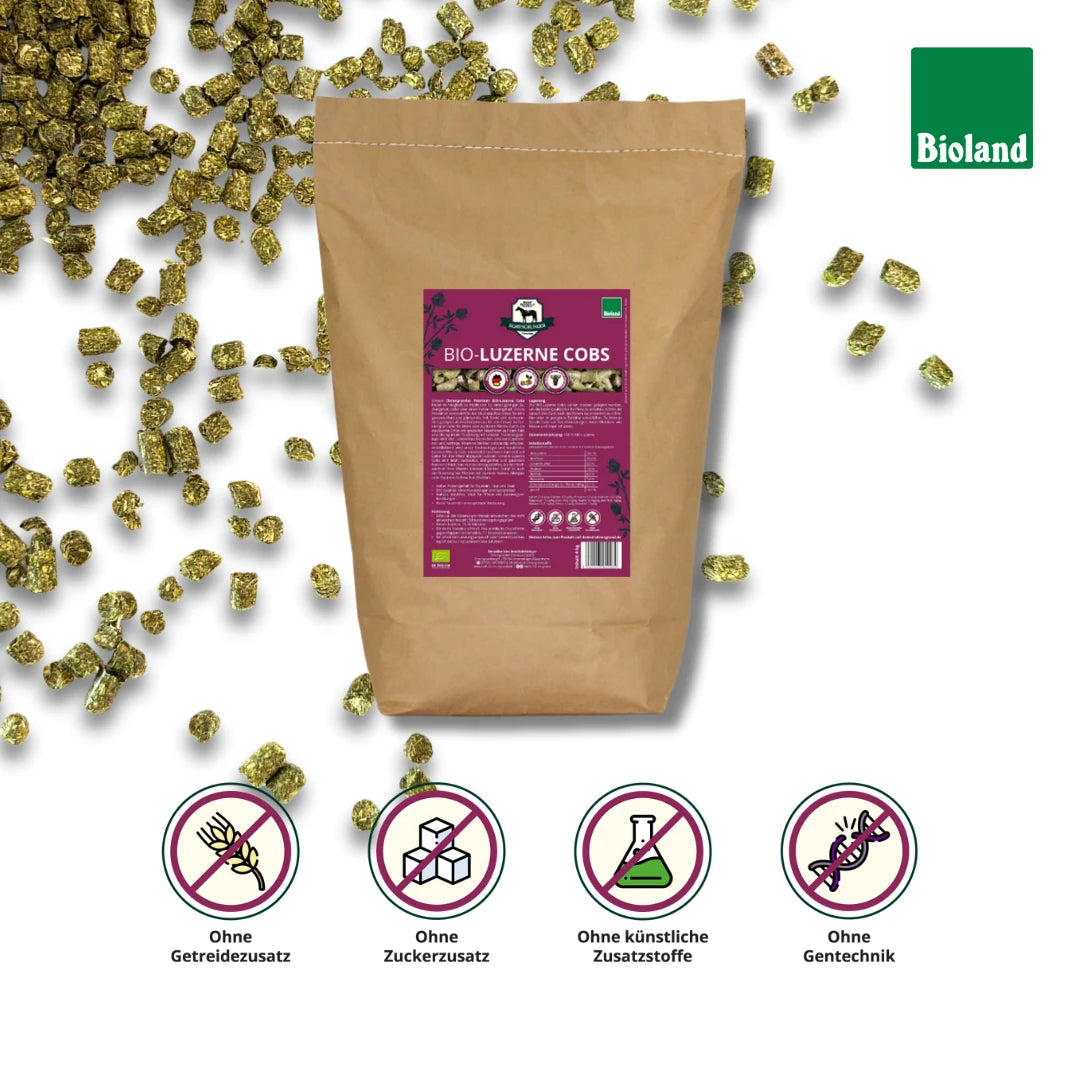 Unsere Luzerne Cobs sind leicht verdaulich, allergenfrei und garantiert frei von schädlichen Konservierungsstoffen, die den Stoffwechsel Ihres Pferdes belasten könnten. Somit ist auch die Fütterung bei Pferden mit starkem Husten, Allergien oder Equinem Asthma kein Problem.