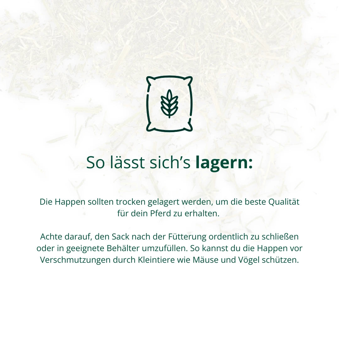 Das Luzerne-Heu wird in unserer Happenpresse schonend gepresst. Die Happen eignen sich gut zur Trockenfütterung und regen die Pferde zum intensiven Kauen und Einspeicheln an. Im Gegensatz zu Luzerne-Häckseln, die aufgrund ihrer kurzen, harten Stängel schwer zu kauen sind und Schleimhautverletzungen verursachen können, bestehen unsere Happen aus gepressten, geknickten Langfasern. Dadurch können die Pferde die Halme mühelos zerkauen, ohne die Verdauung zu belasten.