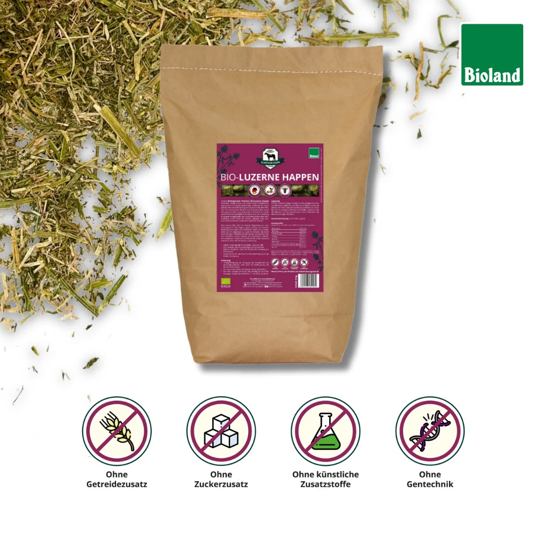 Unsere BIO Luzerne-Happen enthalten wenig Zucker und im Gegensatz dazu einen hohen Proteinanteil. Das macht sie zu einem großartigen Kraftfutter für Sportpferde oder zur Auffütterung von zu dünnen oder alten Pferden. Sie unterstützen den Muskel- und Knochenaufbau sowie eine gesunde Haut und glänzendes Fell.