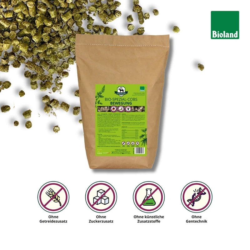 Unsere Elmengrunder Spezial BIO Bewegung Cobs sind eine Kombination aus eigen hergestellter BIO-Kräutermischung, Hanfstängeln und Luzerne und somit ein gesundheitsförderndes Ergänzungsfuttermittel speziell für den Bewegungsapparat.