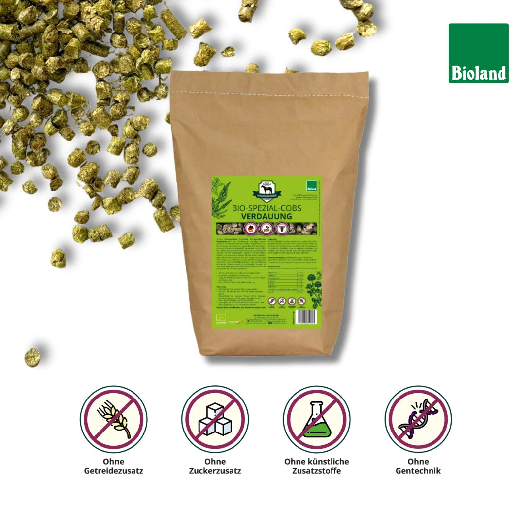Unsere Elmengrunder BIO Spezial Verdauungs Cobs sind eine Kombination aus eigen hergestellter BIO-Kräutermischung, Rotklee, Esparsetten und Brennnesseln und somit ein gesundheitsförderndes Ergänzungsfuttermittel speziell für die Verdauung.