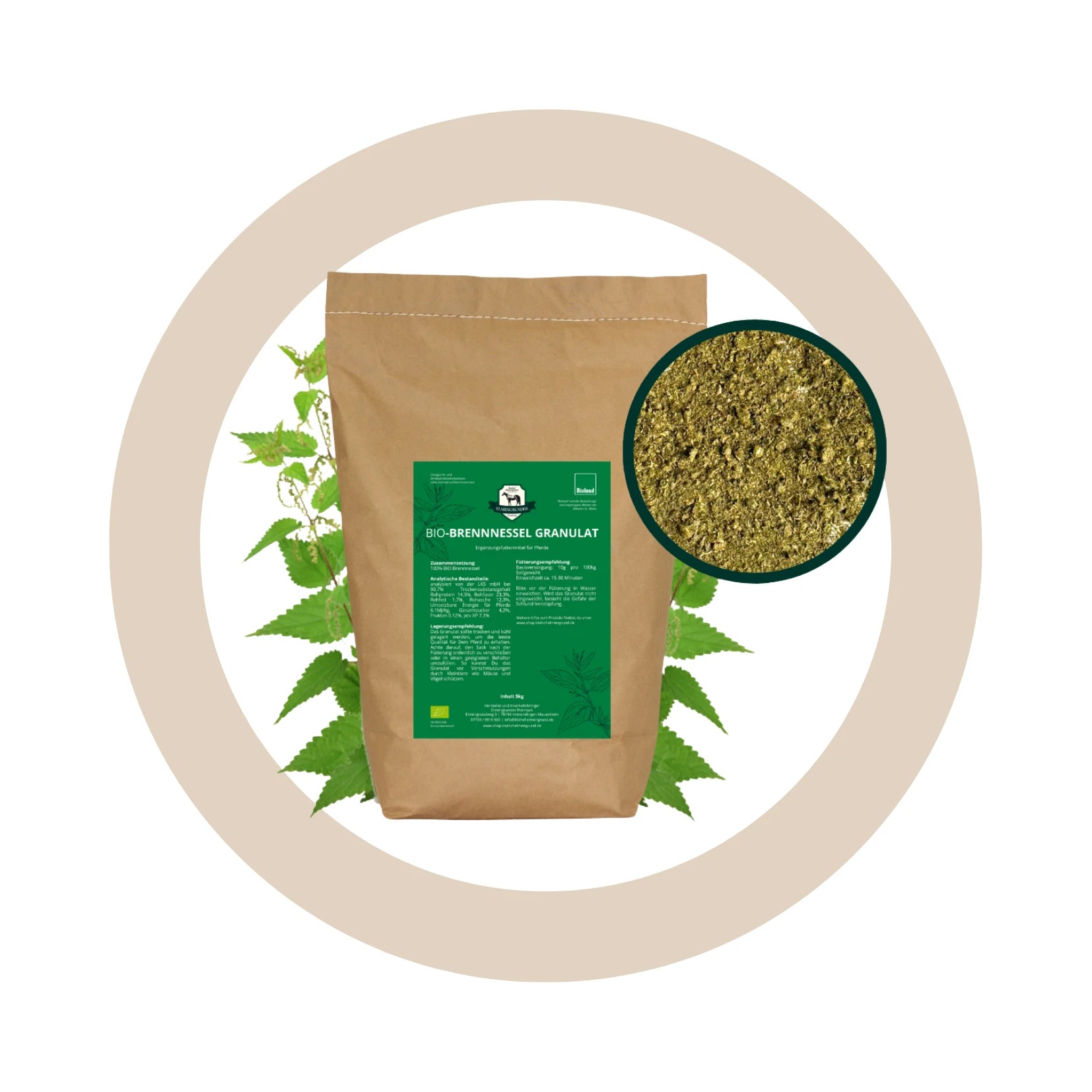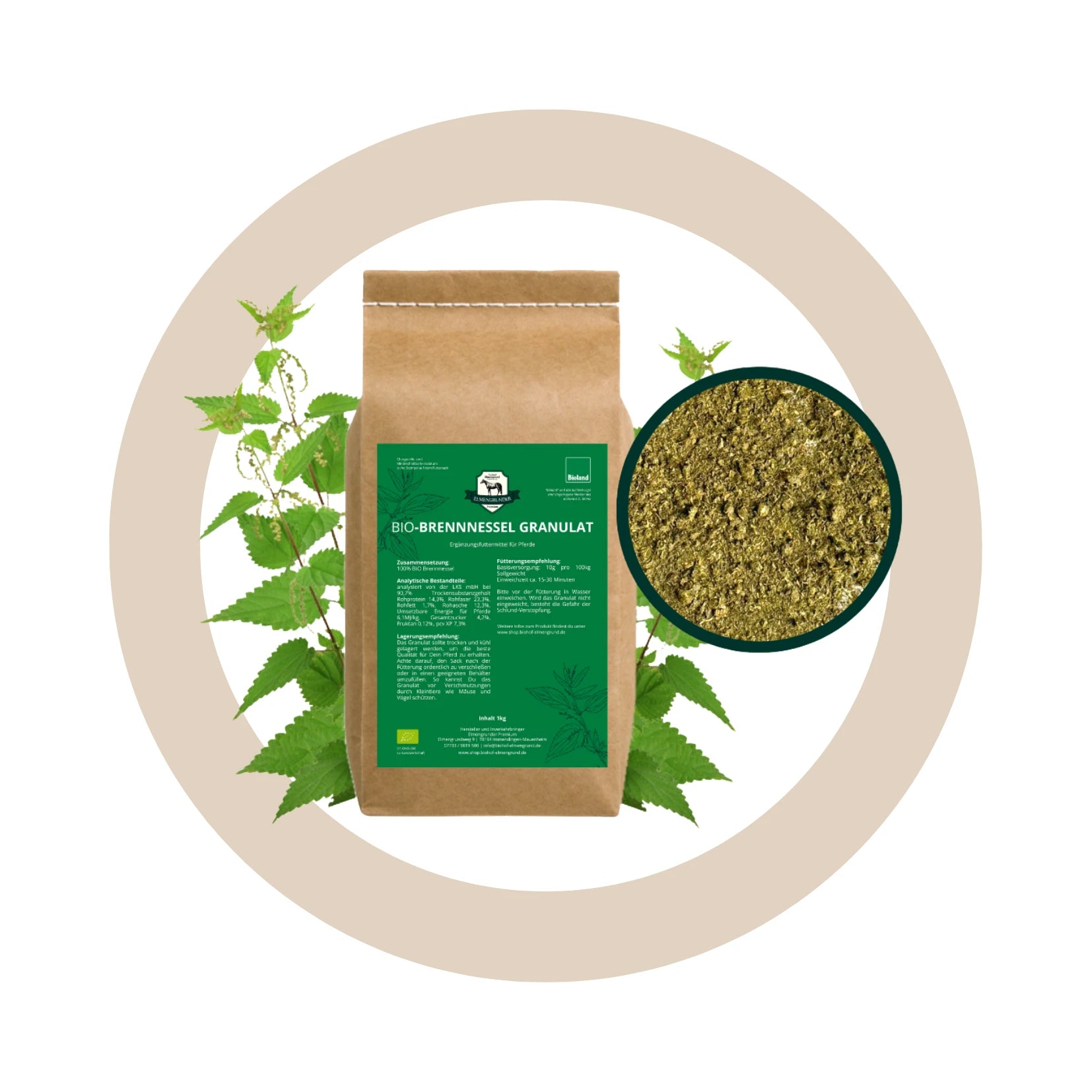 Unser BIO-Brennnessel-Granulat wird aus der gesamten Pflanze hergestellt. Nach der schonenden Ernte erfolgt die Warmlufttrocknung sowie anschließende Pelletierung, um die natürlichen Pflanzenbestandteile weitgehend zu erhalten.