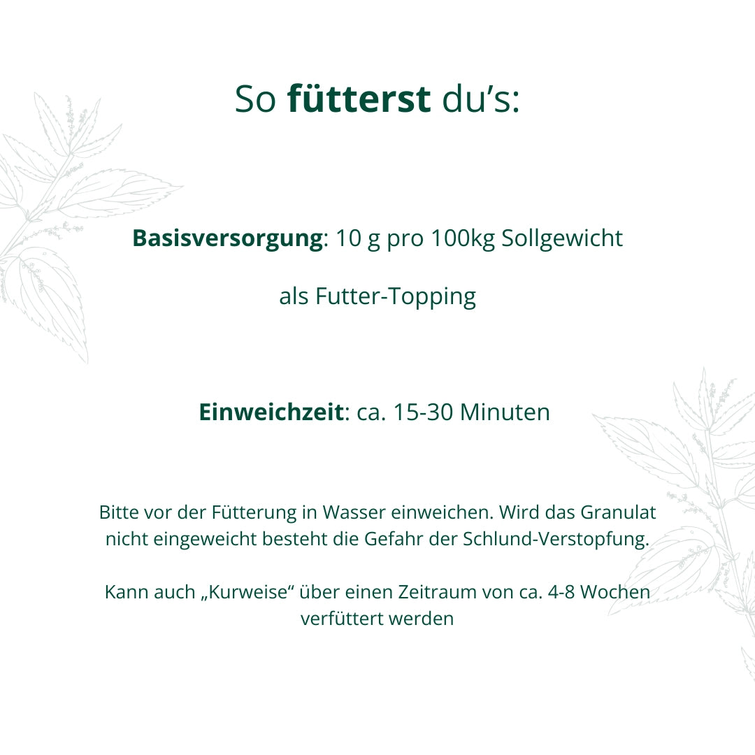 Brennnessel enthält von Natur aus pflanzliche Inhaltsstoffe wie Flavonoide sowie Mineralstoffe, darunter Calcium, Magnesium und Kalium, und Vitamine wie A, C und E. Diese Bestandteile sind Teil einer abwechslungsreichen Pferdefütterung.