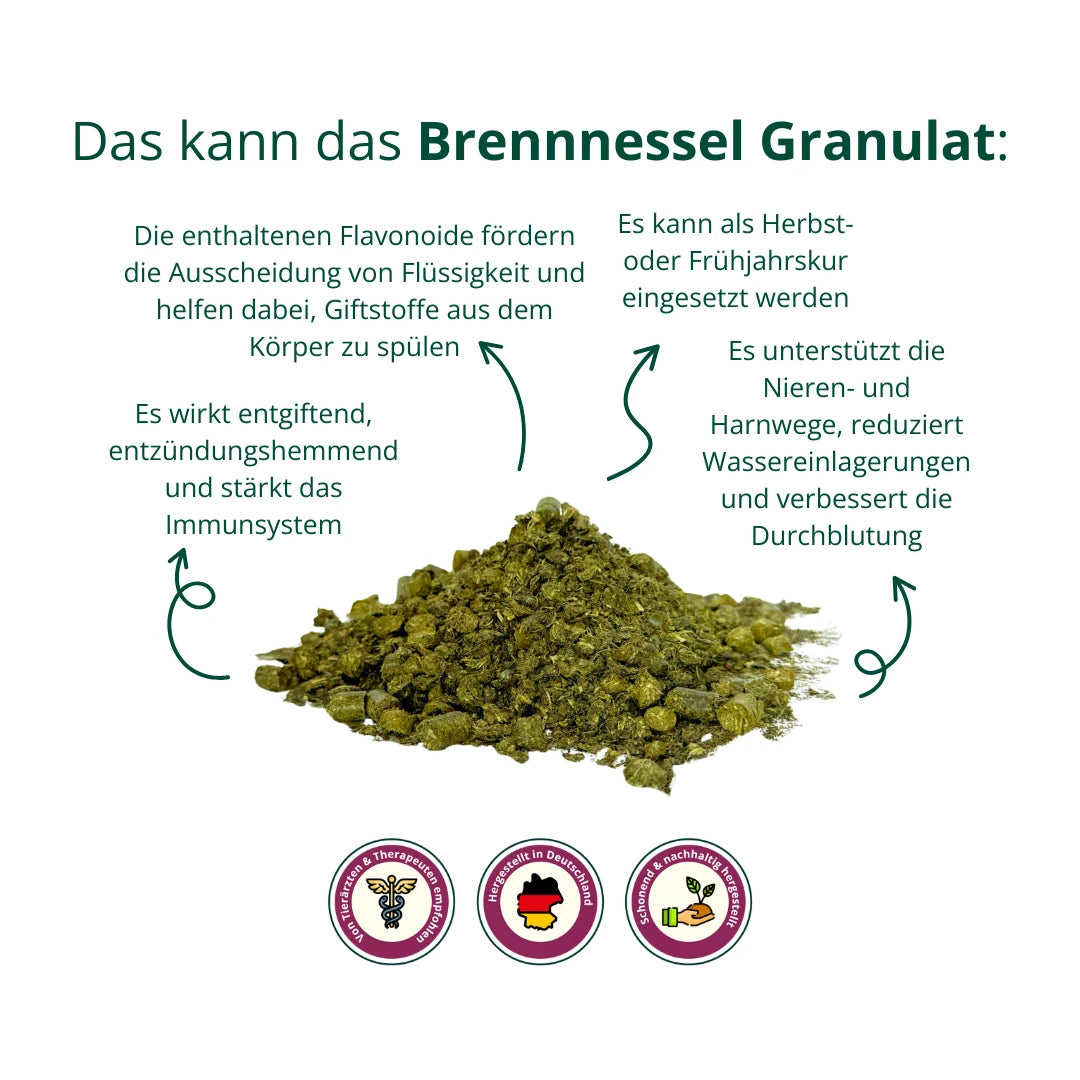 Unser Brennnessel-Granulat ist reich an Calcium, Magnesium, Kalium sowie Vitamin A, C, E und Linolsäure. Sie wirken entgiftend, entzündungshemmend und stärken das Immunsystem. So kann der Brennnessel auch gut als Kur oder im Fellwechsel eingesetzt werden.