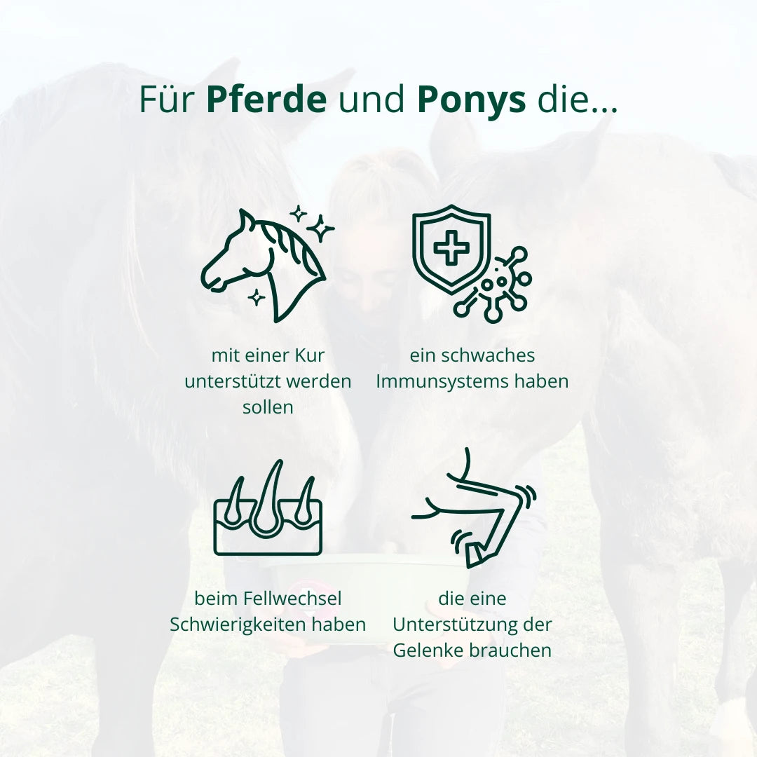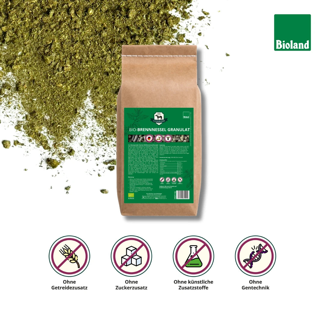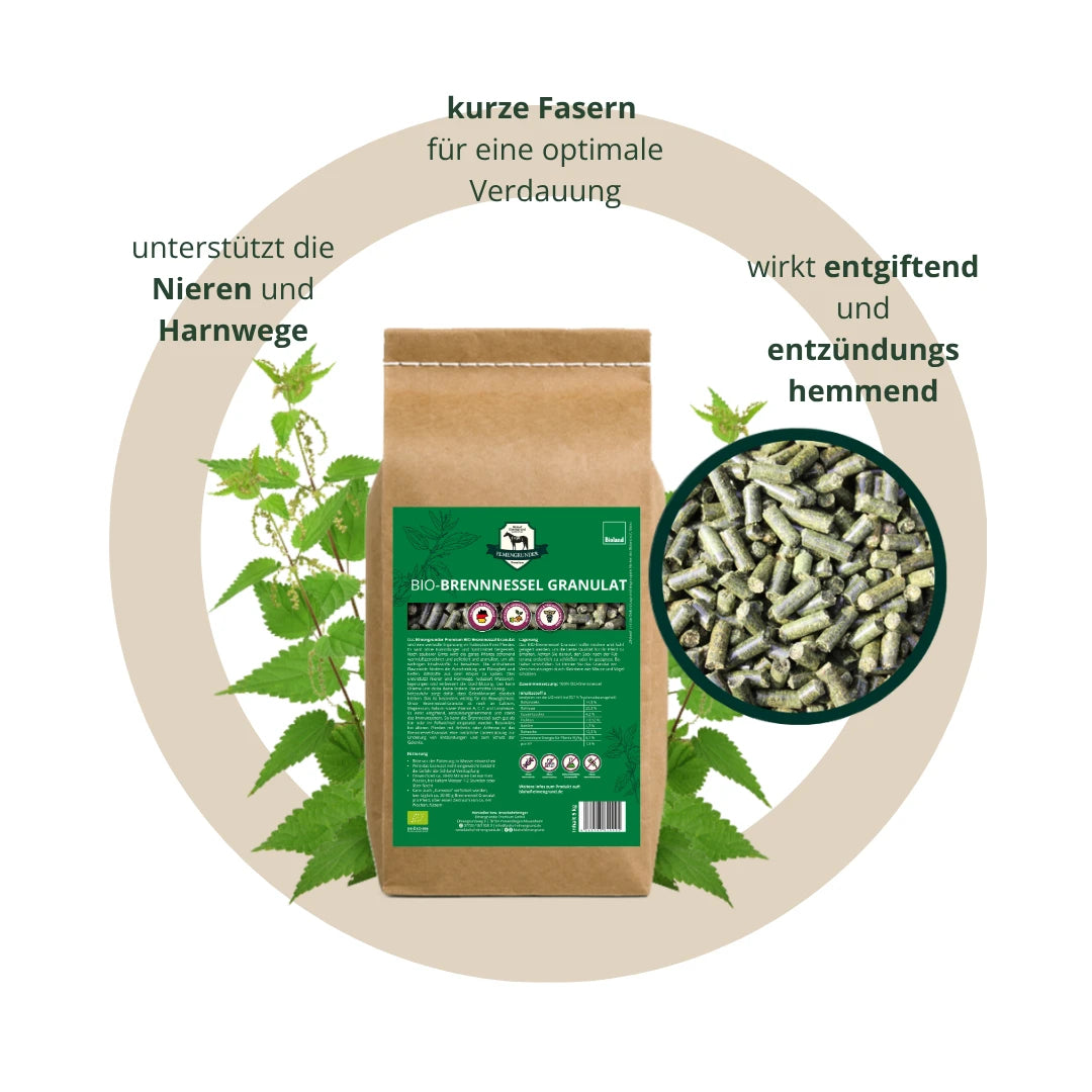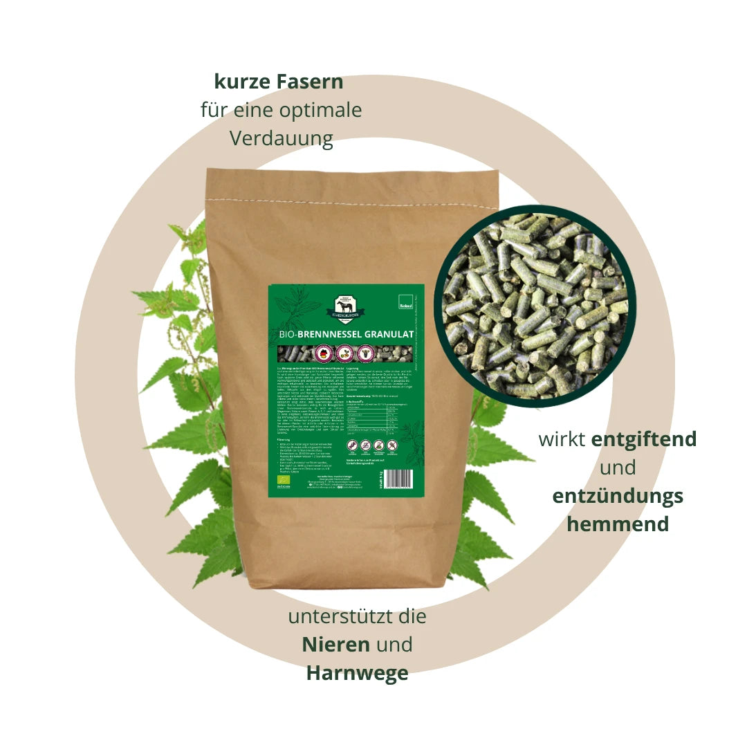 Unser BIO Brennnessel-Granulat ist eine wertvolle Ergänzung im Futterplan Ihres Pferdes.