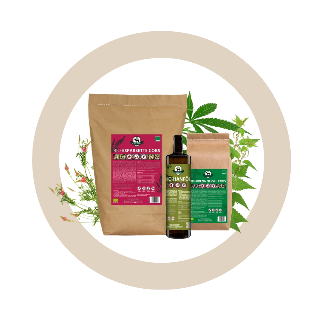 In diesem Bundle erhältst du 1kg Brennnessel, 5kg Esparsette-Cobs und 1 Flasche Hanföl.