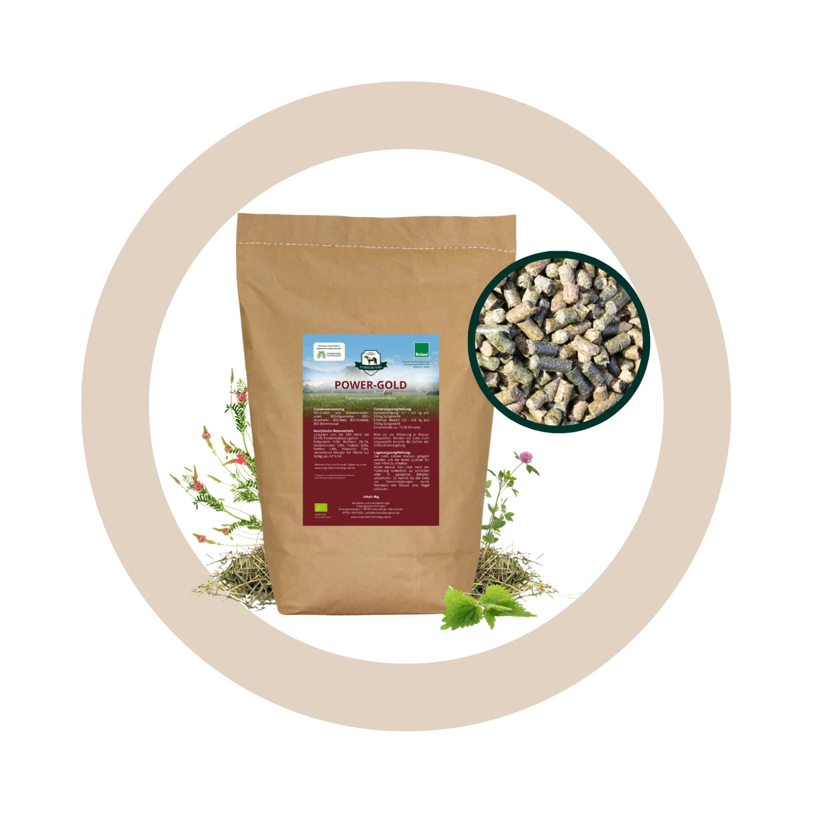 Power-Gold ist ein biologisches, zusammengesetztes Pferdefutter, das als Ergänzungsfuttermittel zur täglichen Fütterung eingesetzt werden kann.