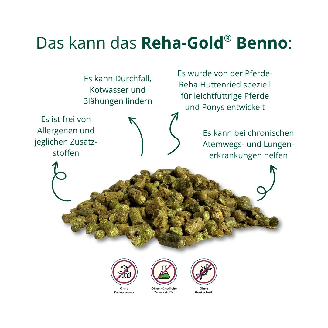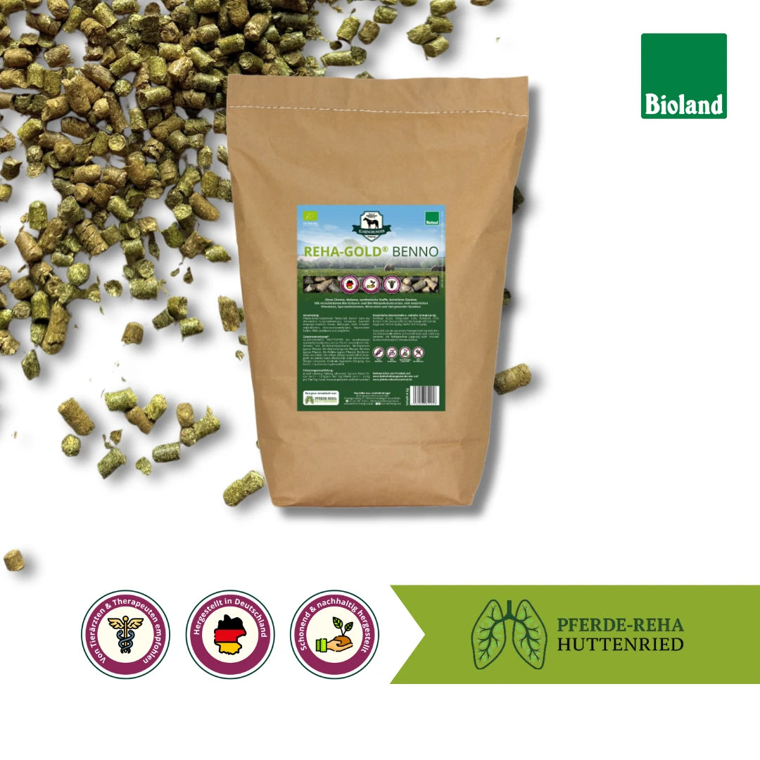 Reha-Gold® „Benno“ ist das einzige biologische zusammengesetzte Pferdefutter was die Genesungszeit Ihres erkrankten Pferdes nachweislich bedeutend verkürzen kann.