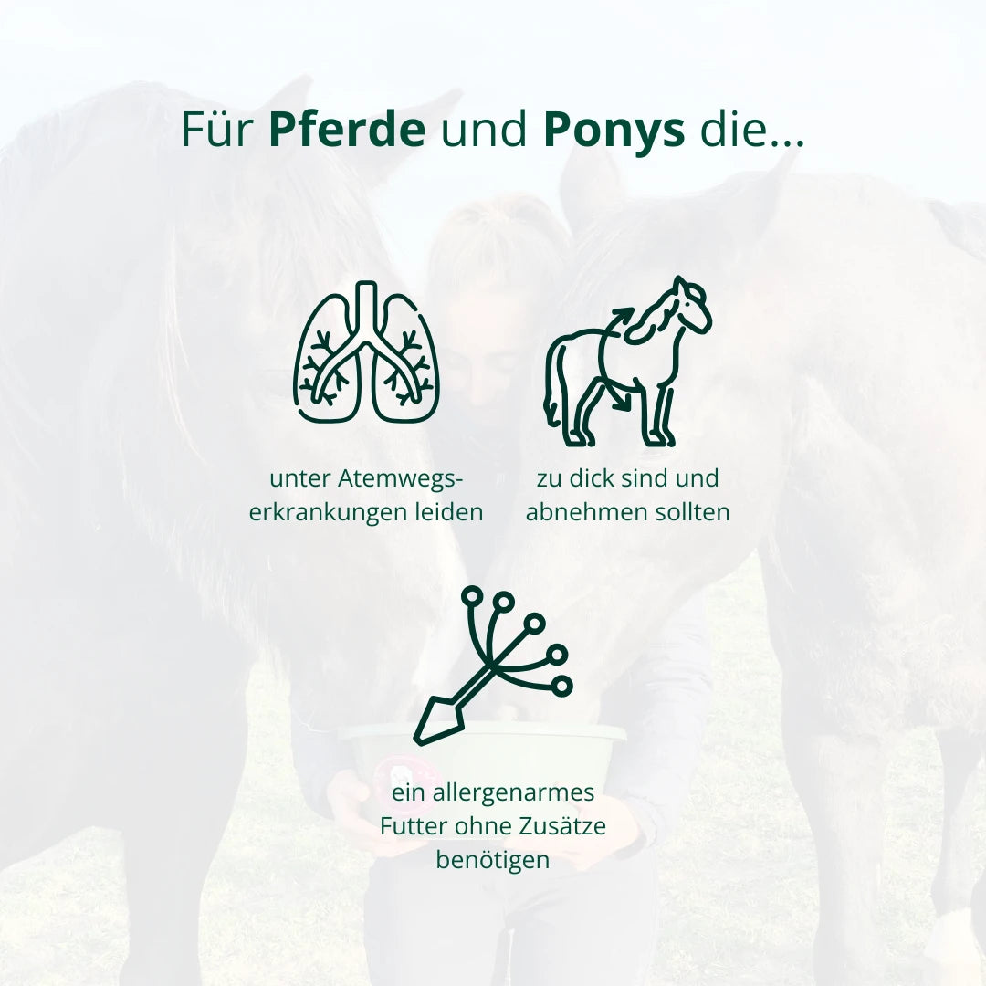 Pferde-Reha-Huttenrieds Reha-Gold® kann helfen bei chronischen Lungenerkrankung, Kotwasser, Durchfall, Magengeschwüren, Ekzem, Blähungen, Kolik, Fellwechselproblemen und Wasseransammlungen. Es wurde speziell für leichtfuttrige Pferde und Ponys entwickelt.